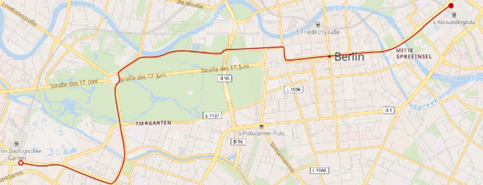 Von den Neubauten rund um den Zoo geht es über das Botschaftsviertel, den Tiergarten, das Regierungsviertel, über die Prachtallee Unter den Linden bis hin zum Alexanderplatz. Entlang der Strecke liegen Sehenswürdigkeiten wie die Gedächtniskirche und der Berliner Dom, der Reichstag und das Schloss Bellevue, die Siegessäule und der Fernsehturm, das Brandenburger Tor und die Friedrichstraße.